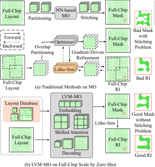 图2 传统掩膜优化流程与基于大视觉模型的全芯片尺寸掩膜优化流程对比