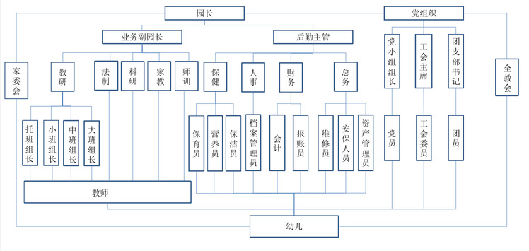 幼儿园设置保教、后勤、人事等职能部门,分别承担相应的管理职责。